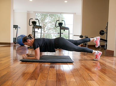 Aqui você pode alternar o apoio dos pés (como na foto acima) ou ficar com os dois apoiados no chão. Na primeira opção, faça duas séries de 12 repetições assim: eleve um dos pés o máximo que conseguir com a perna estendida e volte a apoiá-lo no chão para trocar de perna. Levante um, depois o outro, alternando sempre. Quando completar o número de repetições, descanse por 30 segundos antes de começar a segunda série. Se você estiver muito em forma, pode tentar fazer três séries de 15 repetições. Se preferir outra opção, tente ficar por 30 segundos paradinha. Atenção para a postura: não deixe que os ombros se aproximem das orelhas e mantenha a barriga bem contraída. O objetivo é tentar ficar com o corpo paralelo ao chão.